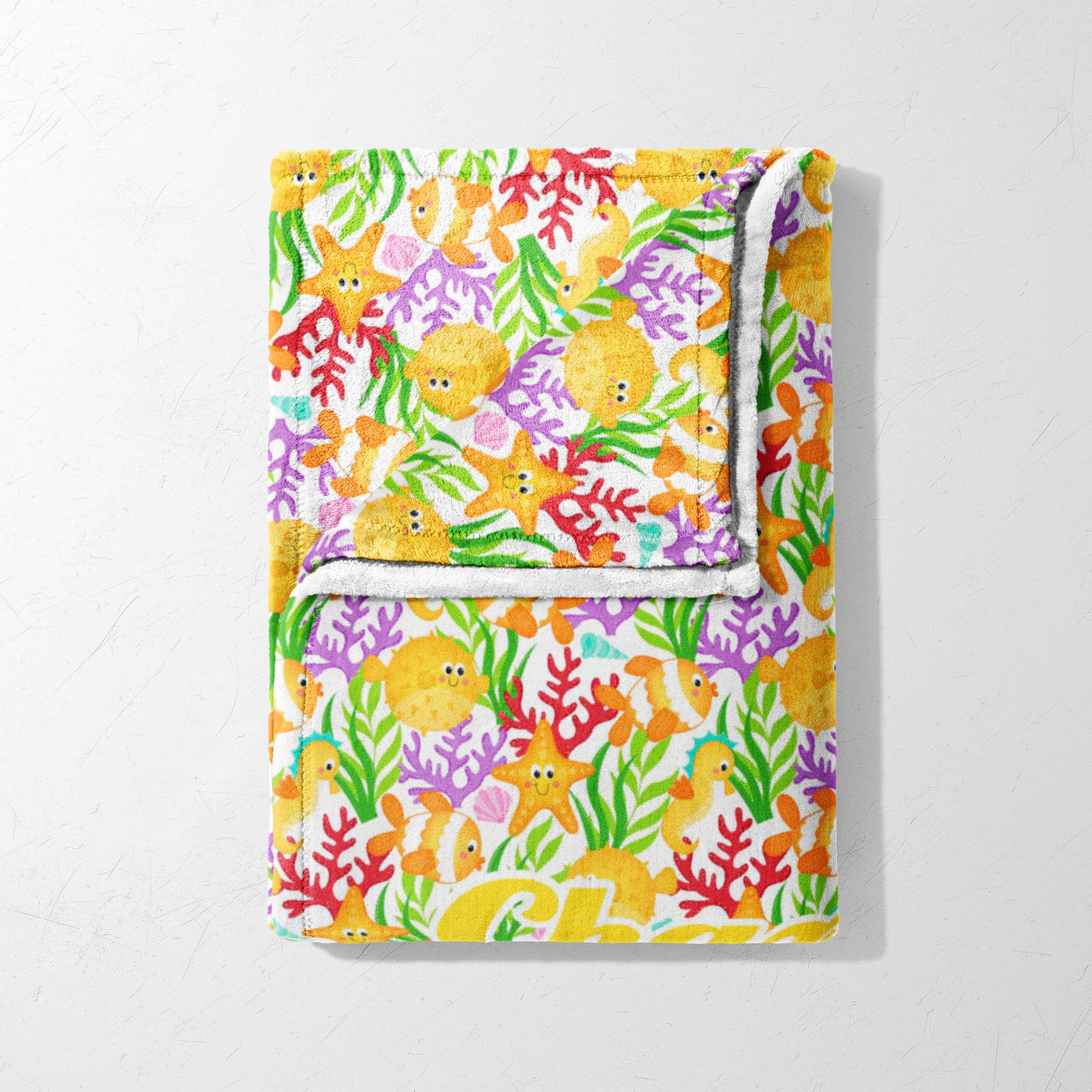 Imagine swimming through a colorful coral reef with all your sea creature friends! Our Coral Cove Cuddle Blanket is like a warm hug from the ocean, and it's super soft and cuddly, perfect for wrapping up after a bath or while dreaming of exploring hidden underwater treasures. This blanket is great for boys and girls who love ocean adventures and colorful sea creatures! And guess what? You can even add your name to make it extra special!