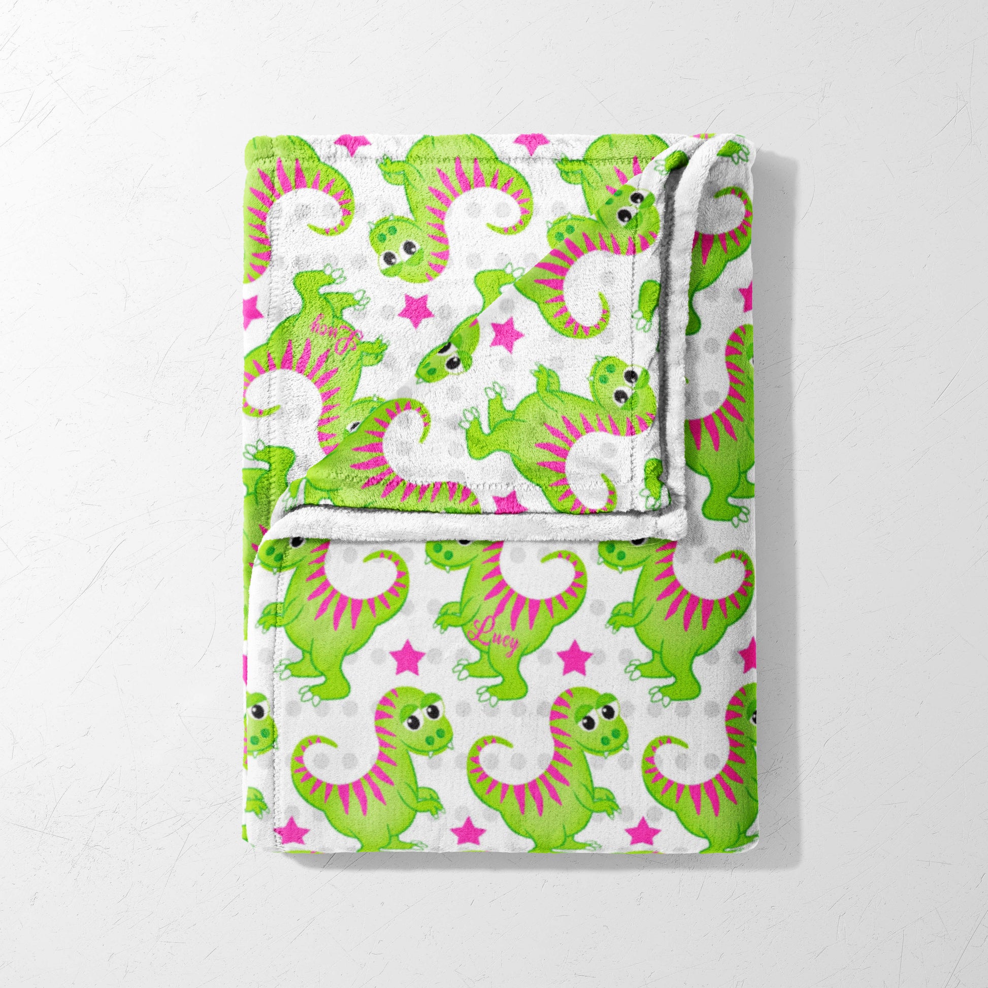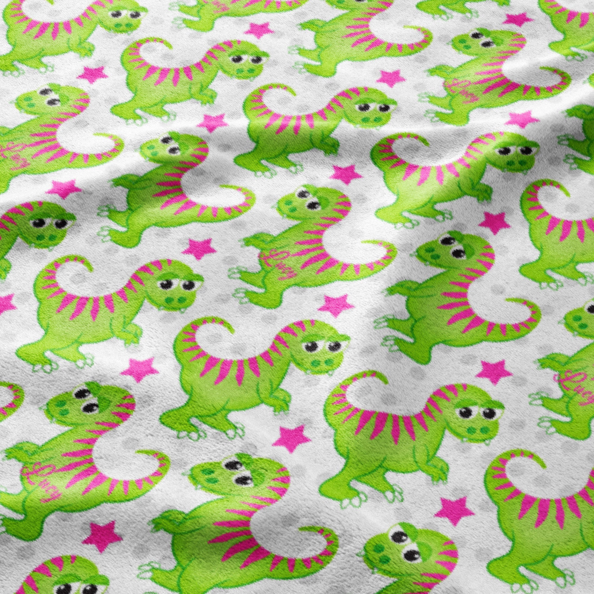 Snuggle up with our adorable Dino Dash Delight blanket! This super-soft blanket features a playful pattern of bright green dinosaurs with fun pink stripes, all dancing around pink stars. It's perfect for keeping your little one cozy during nap time, playtime, or anytime they need a hug. Made with [mention material, e.g., soft fleece, plush cotton], this blanket is gentle on sensitive skin and easy to care for. Let your child's imagination roar with this fun and cuddly dinosaur blanket!