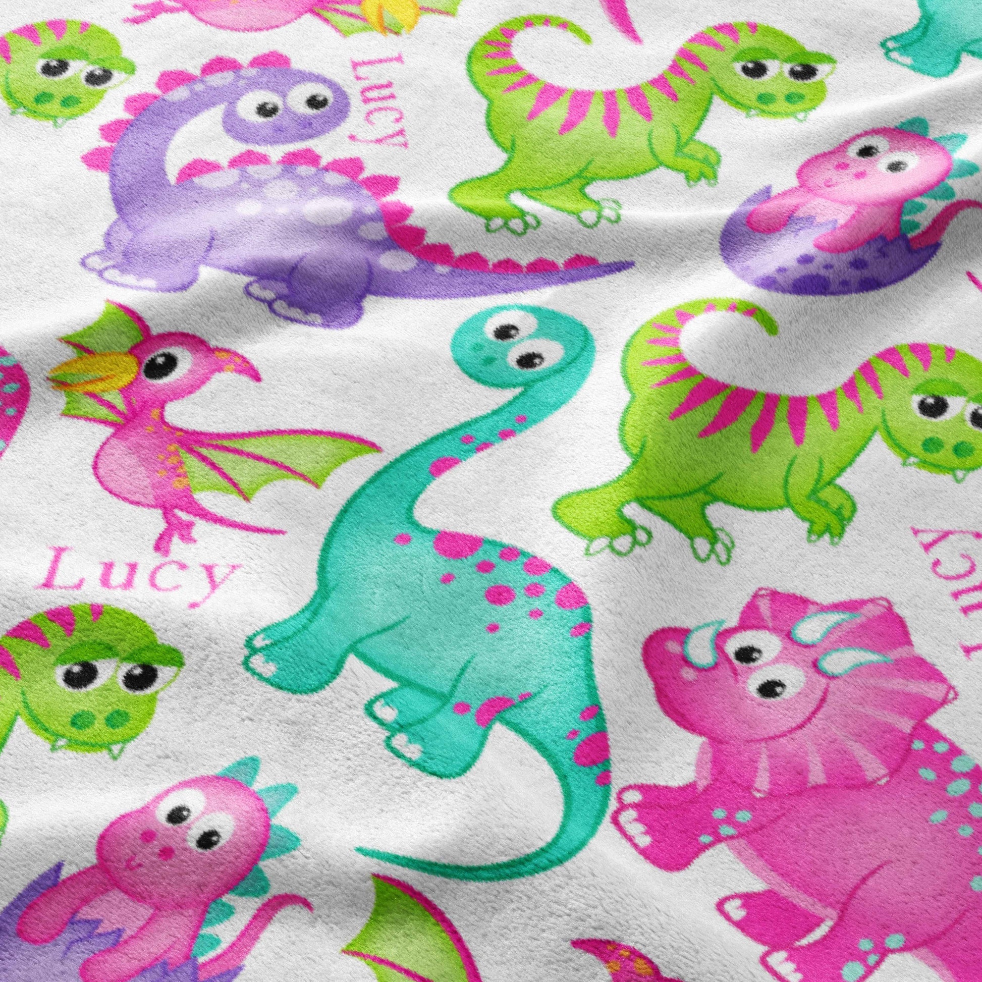 Woo-hoo! Get ready for a Dino adventure with this awesome blanket! It's like a playground for the coolest cartoon dragons ever! They come in all sorts of crazy colors – pink, green, purple – you name it! And guess what? They're all super silly and friendly, with big smiles and goofy grins.