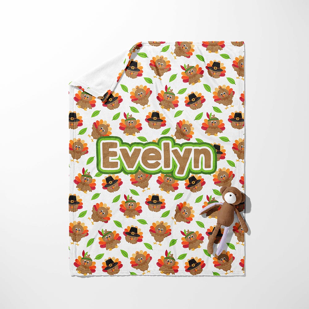 Get ready for a cozy Thanksgiving with the Feathered Friends Personalized Snuggle Blanket! This blanket is perfect for your little girl or boy during the holiday season, featuring adorable turkeys wearing pilgrim hats and colorful feathers, like a happy Thanksgiving gathering. Made from the coziest, high-quality fleece, it's perfect for snuggling up during holiday movies, reading Thanksgiving stories, or any time your little one wants to feel extra warm and festive. This throw isn't just super soft; it's also personalizable, making it a truly special gift. Imagine adding your little one's name to make it their very own! Whether it's for playtime or bedtime, this blanket is sure to bring smiles and a little Thanksgiving joy.