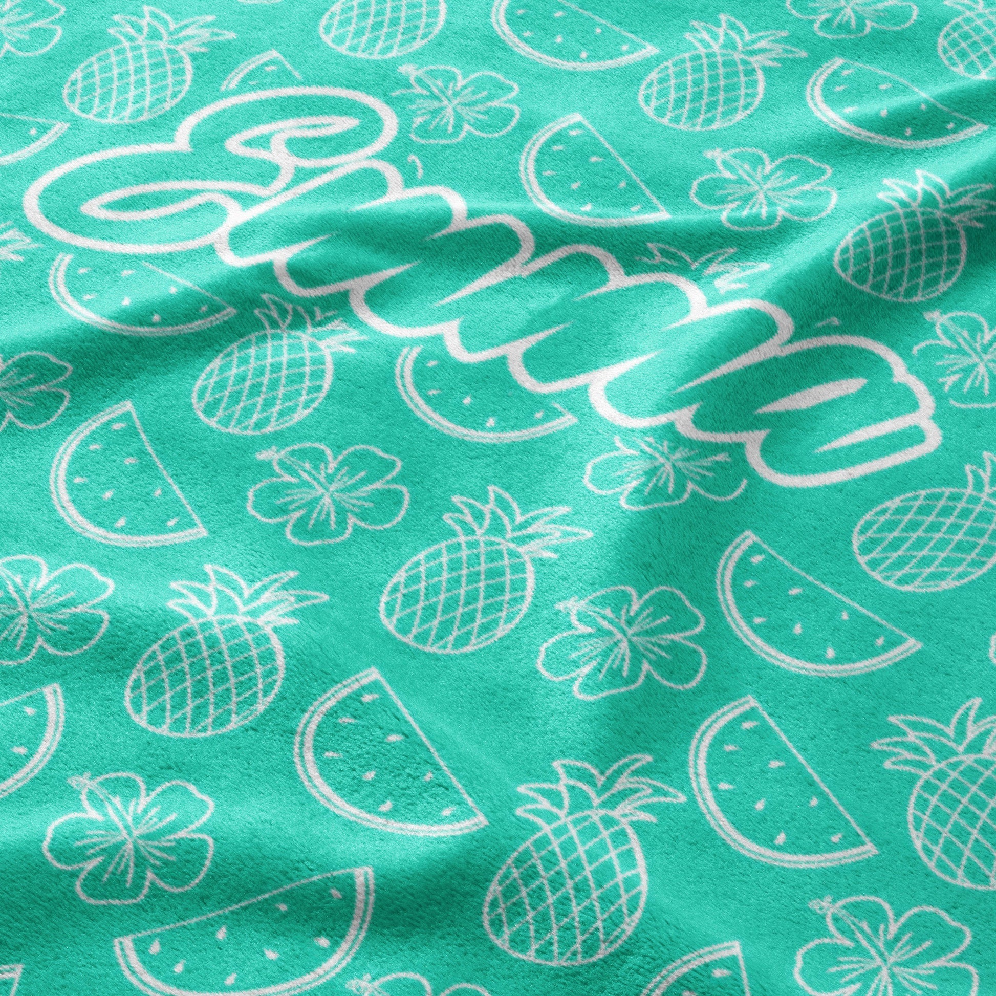 Dive into cozy comfort with our Ocean Breeze Fruit Blanket! This isn't just a throw, it's a splash of tropical fun! Imagine wrapping yourself in the softest plush fabric, perfect for snuggling up and dreaming of ocean breezes and sweet summer treats. The blanket features a refreshing pattern of pineapples, watermelons, and hibiscus flowers in a cool teal and white design, like a refreshing dip in the ocean! It's perfect for snuggling during story time, keeping warm during movie nights, or creating a cozy hideaway. And the best part? You can make it truly yours by personalizing it with a name or a special message. It's the perfect gift for any little one who loves the beach and fruity delights!