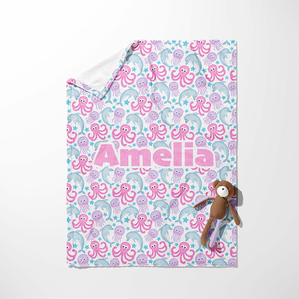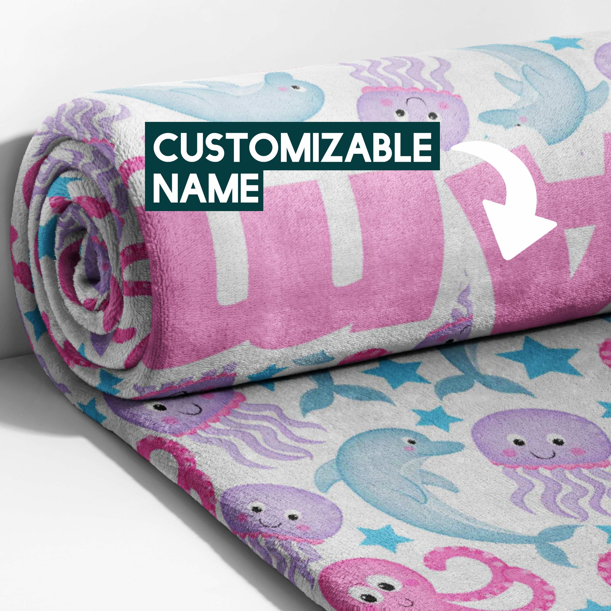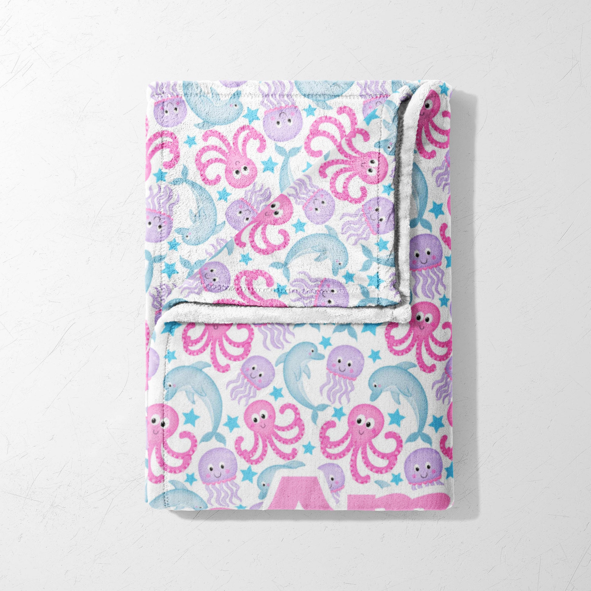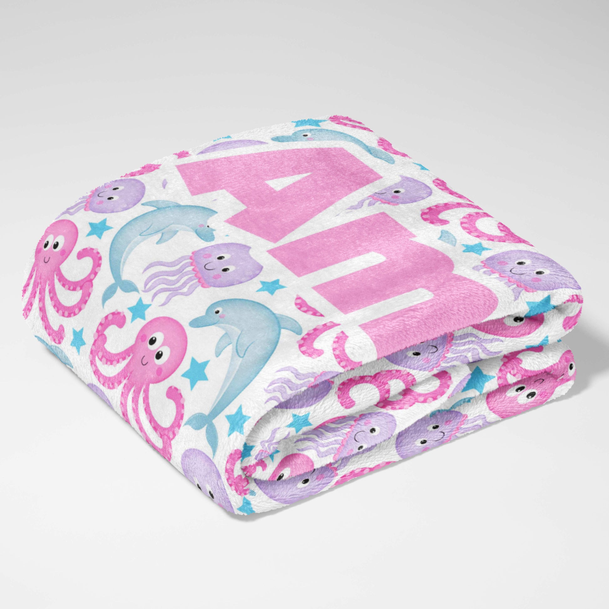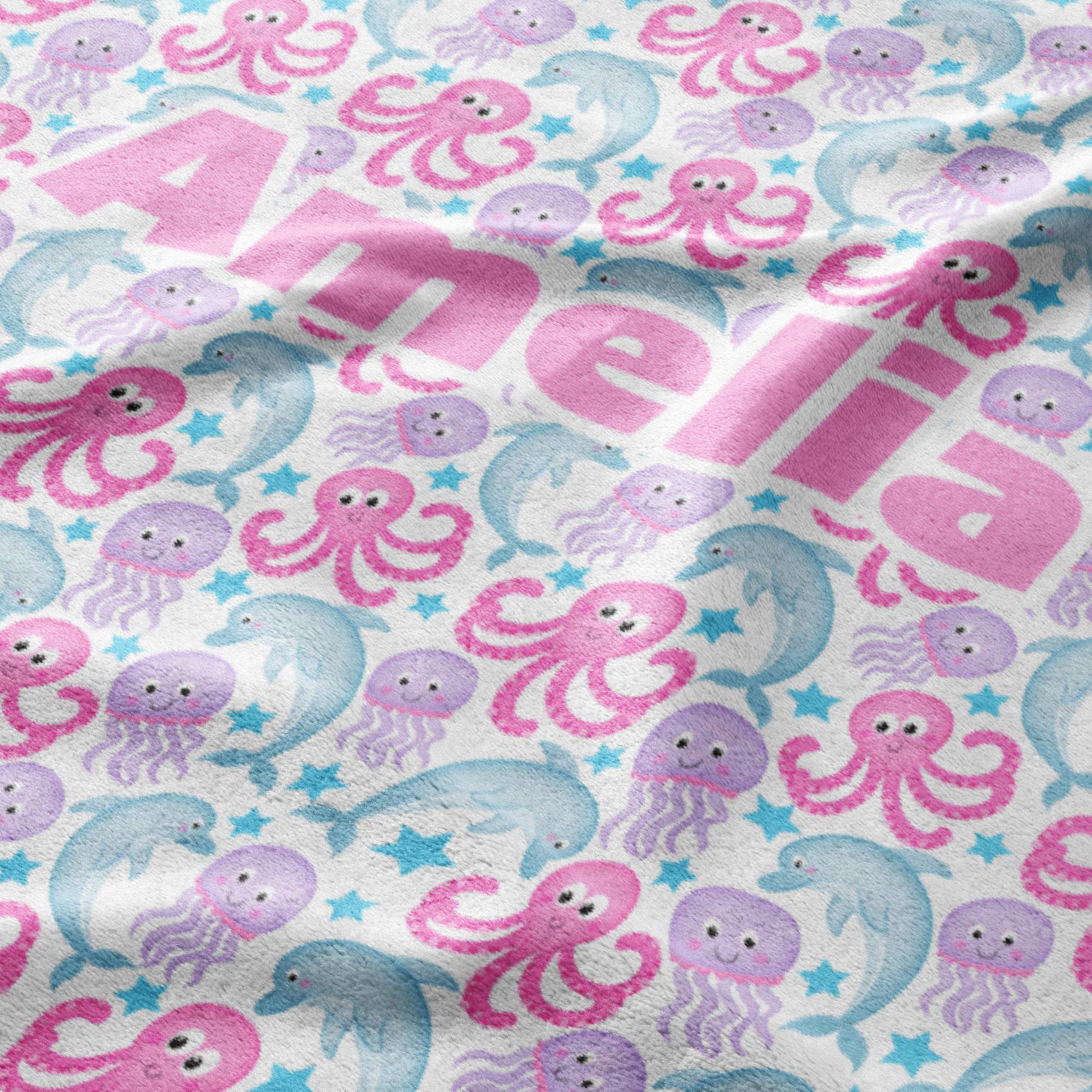 Dive into a world of cuddles with our Ocean Dreams Snuggle Blanket! It's like a warm hug from your favorite sea creatures, perfect for wrapping up after a bath or dreaming of underwater adventures with dolphins, octopuses, and twinkling stars. This super-soft blanket is great for girls who love the ocean! And guess what? You can even add your name to make it extra special!