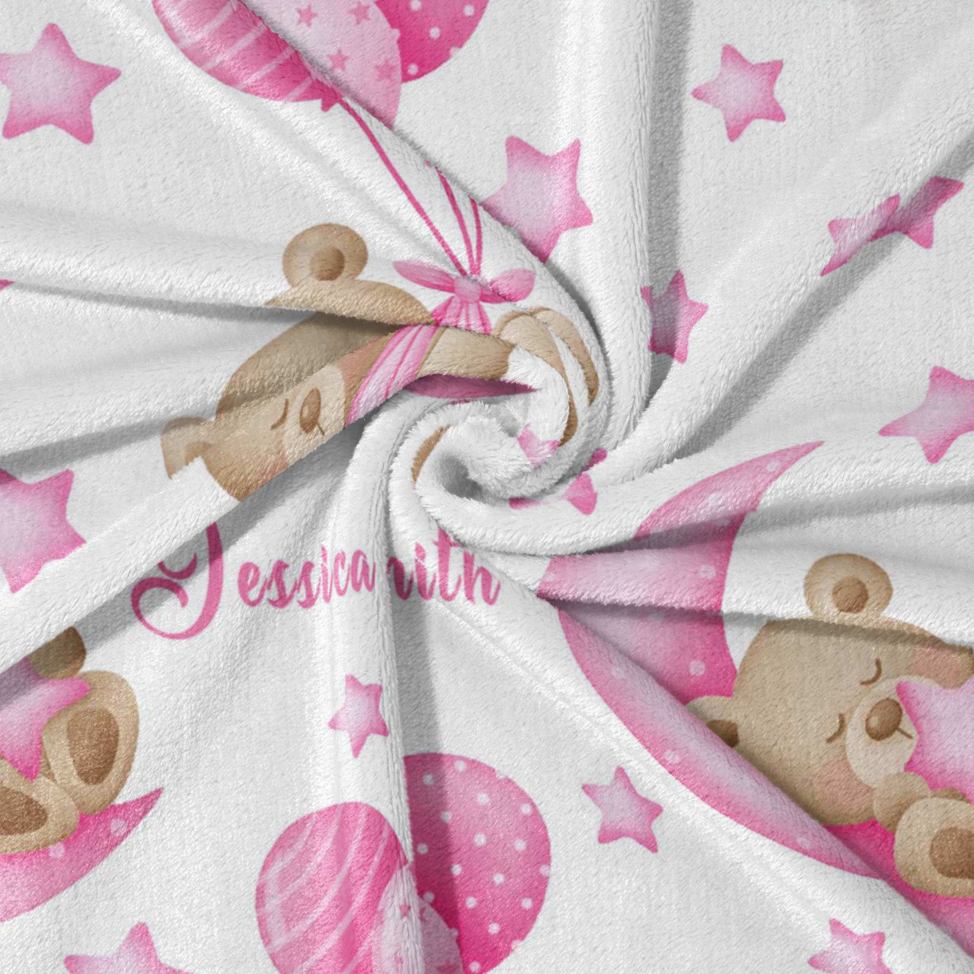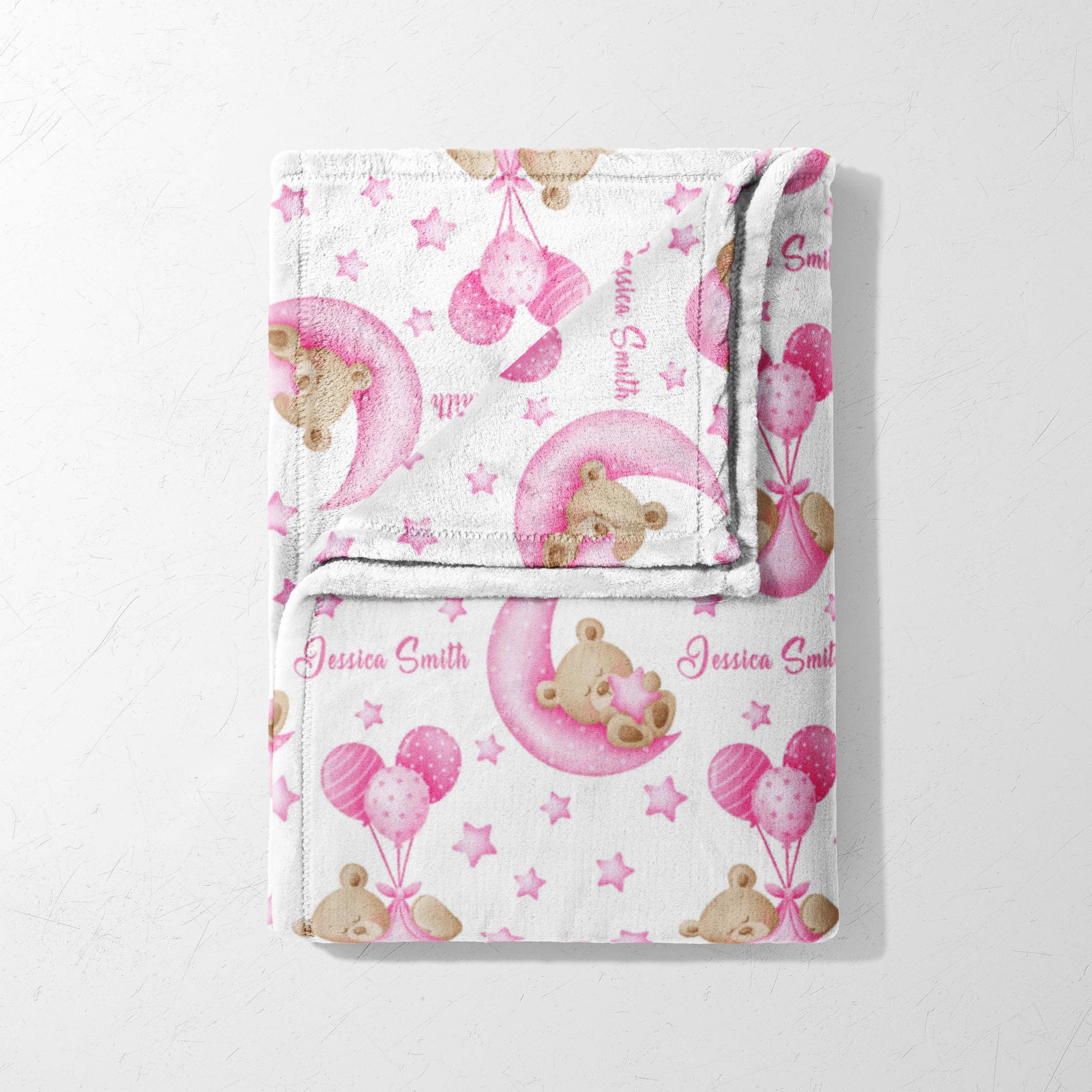 Drift off to dreamland with our Teddy Moon & Balloon Dreams Fleece blanket! This super soft fleece blanket features adorable teddy bears nestled in pink crescent moons, holding onto sweet pink balloons, and surrounded by twinkling stars. It's perfect for keeping your little one warm and cozy during nap time, bedtime, or stroller rides. The gentle fleece fabric is kind to sensitive skin and machine washable for easy care. Give the gift of cuddly comfort with this charming blanket!
