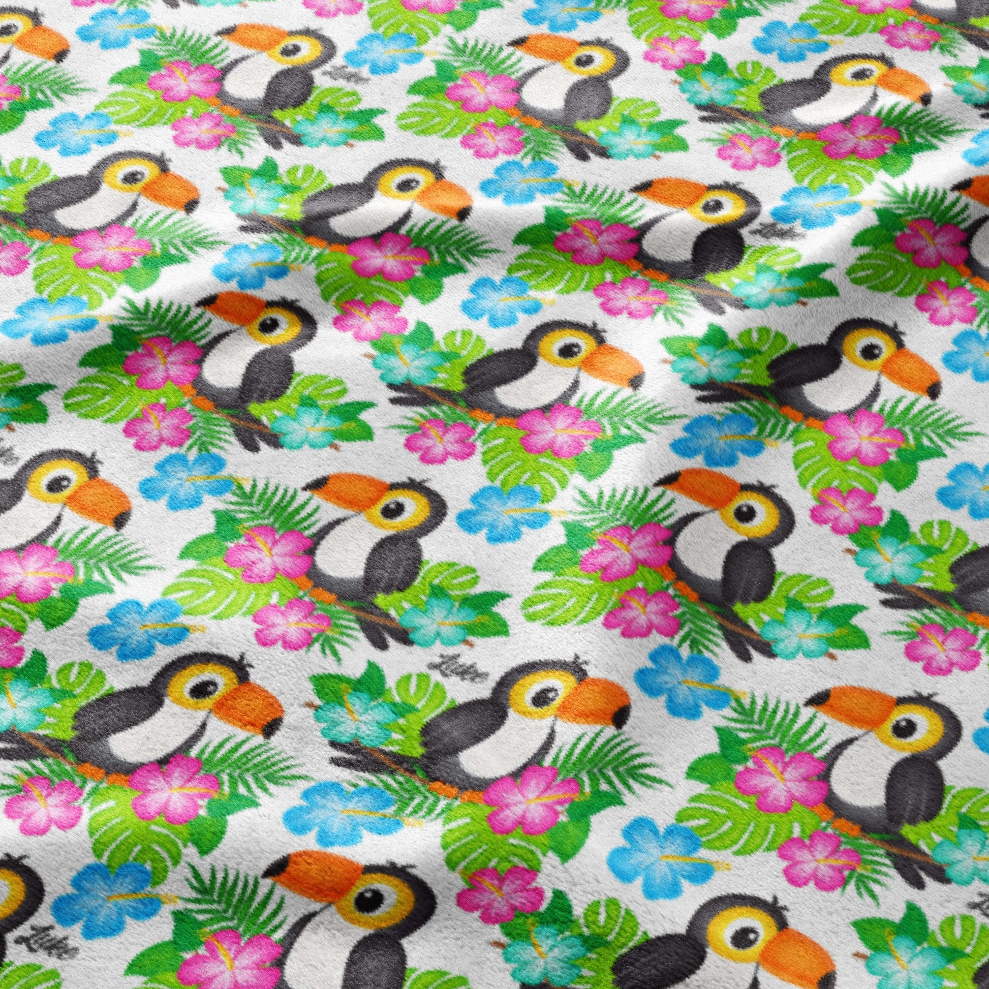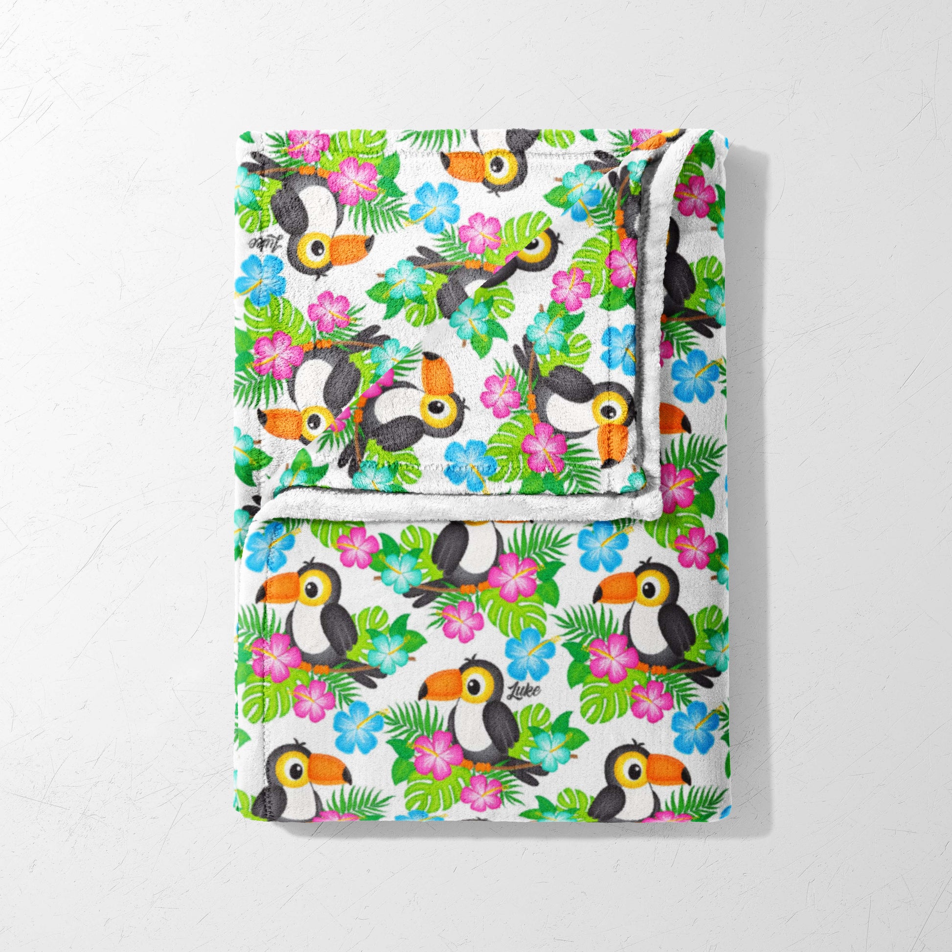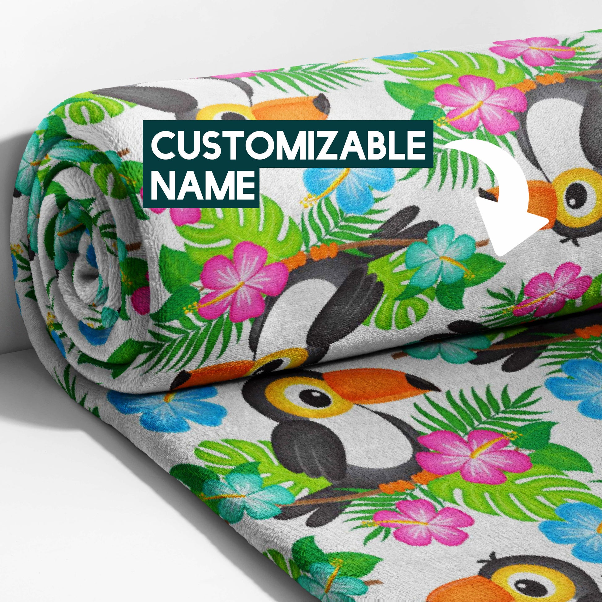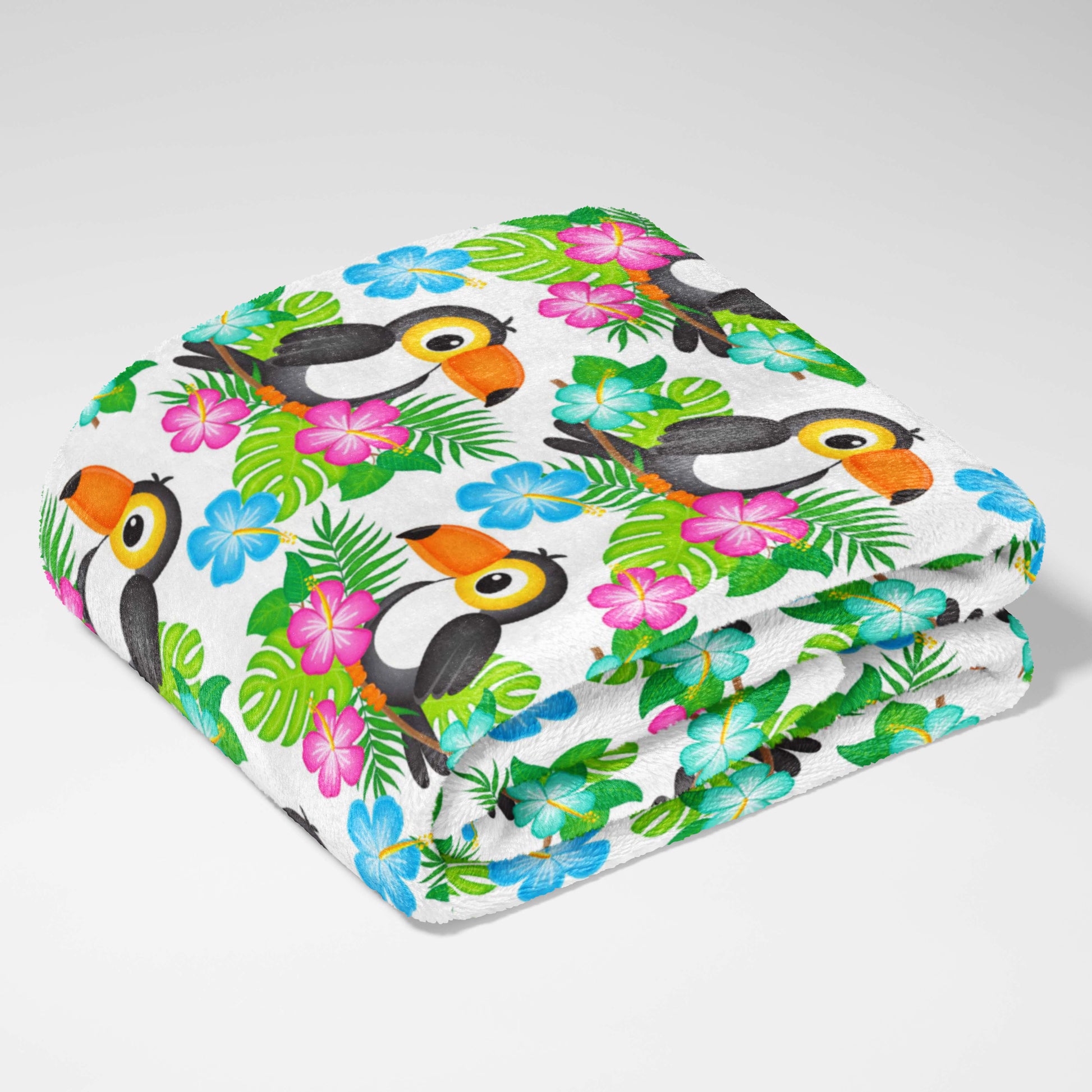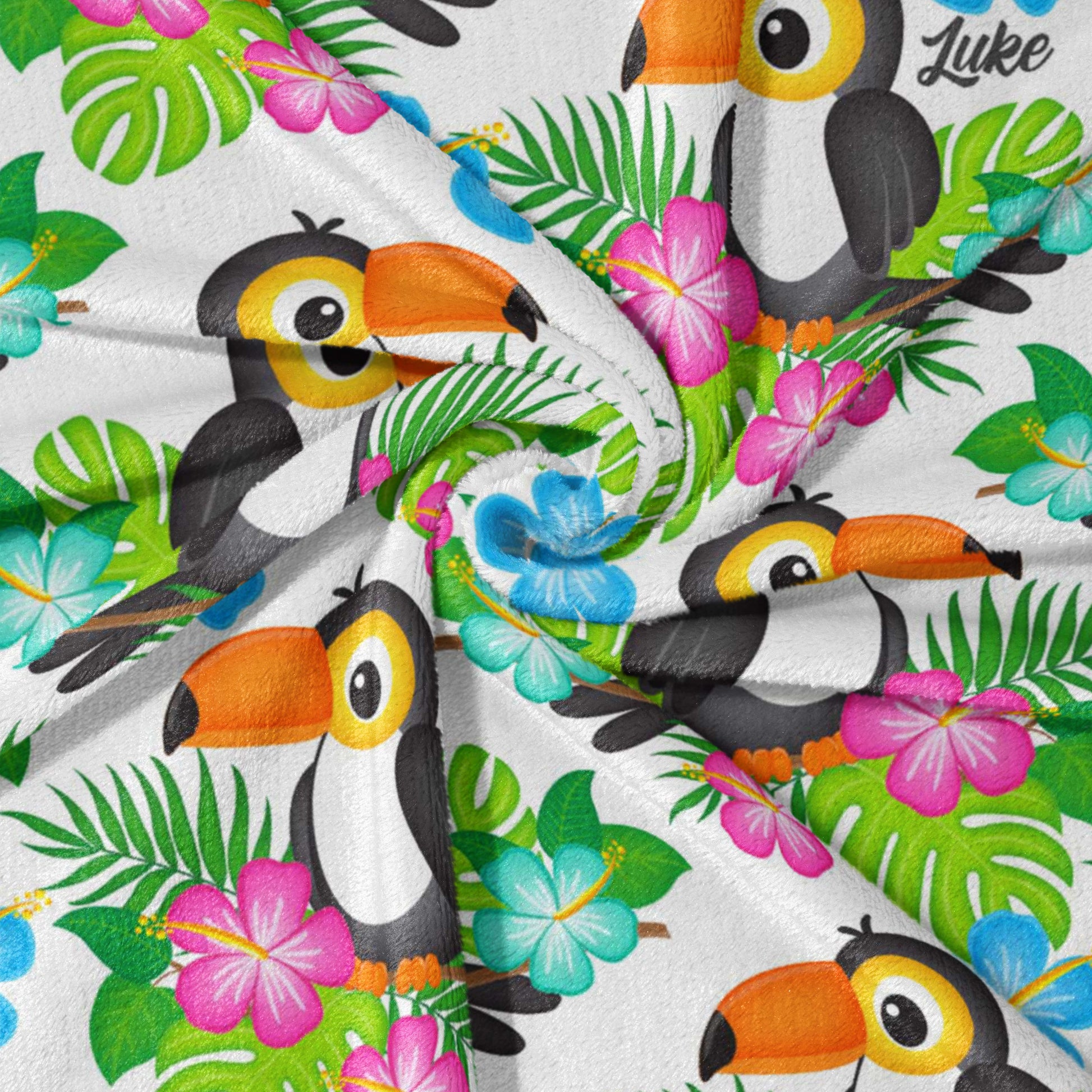 Get ready for a jungle adventure with our Toucan Tropical Paradise Blanket! It's got toucans with bright orange beaks, colorful flowers, and green leaves – it's like a party in the rainforest! This blanket is super soft and snuggly, perfect for wrapping up after a bath or while you're reading a book about far-off lands. It's great for boys and girls who love animals and exploring!