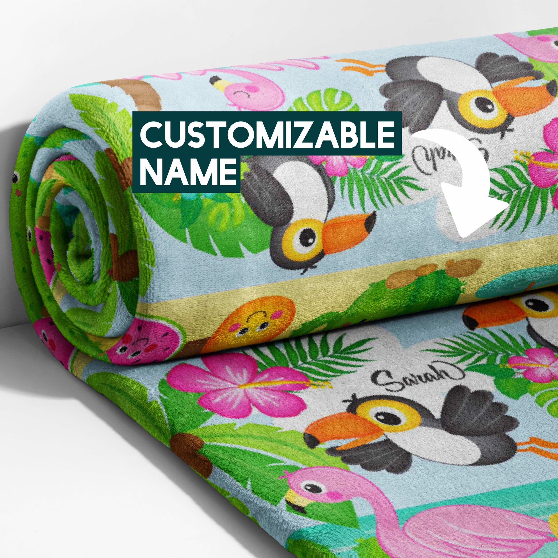 Get ready to fiesta with our Tropical Fiesta Friends Blanket! It's got toucans, flamingos, cacti wearing sombreros, and even watermelon slices! It's like a big party in the jungle! This blanket is super soft and cozy, perfect for snuggling up after a bath or while you're dreaming of sunny vacations. It's great for boys and girls who love animals and having fun!