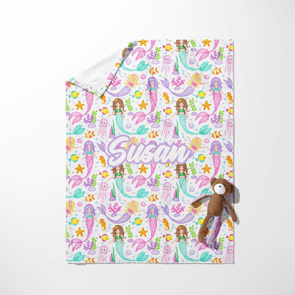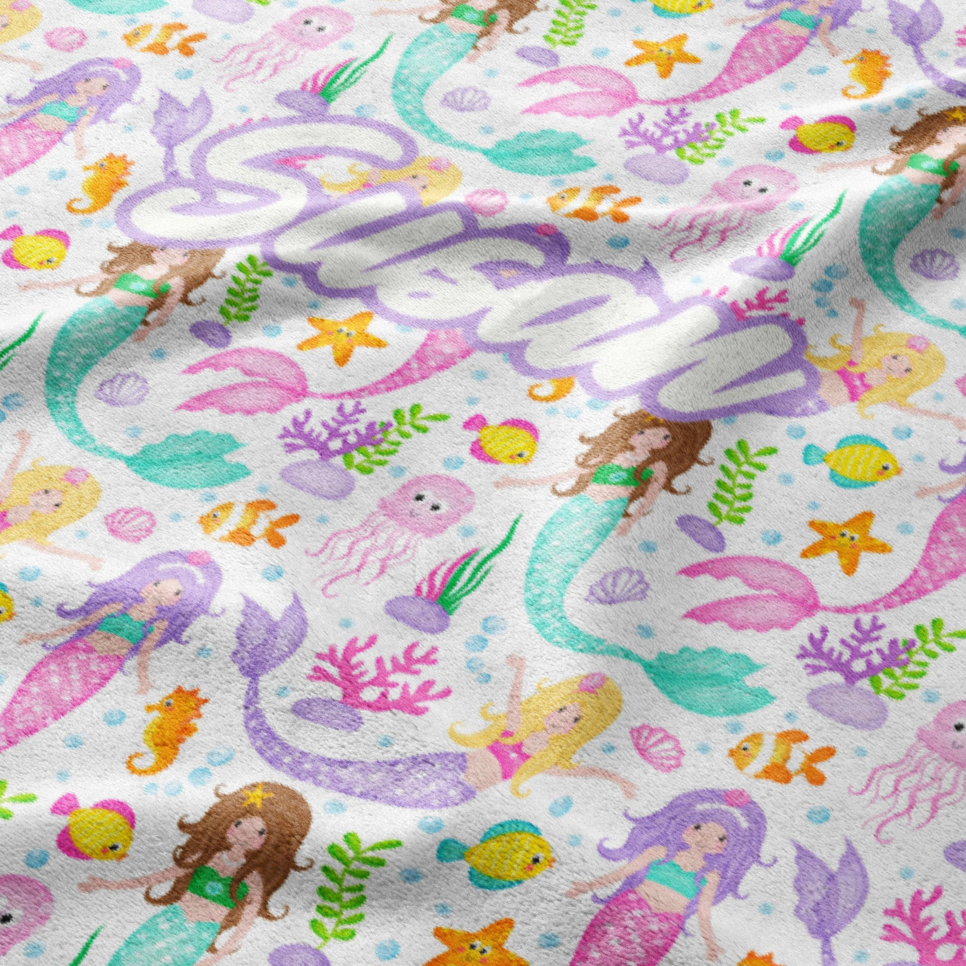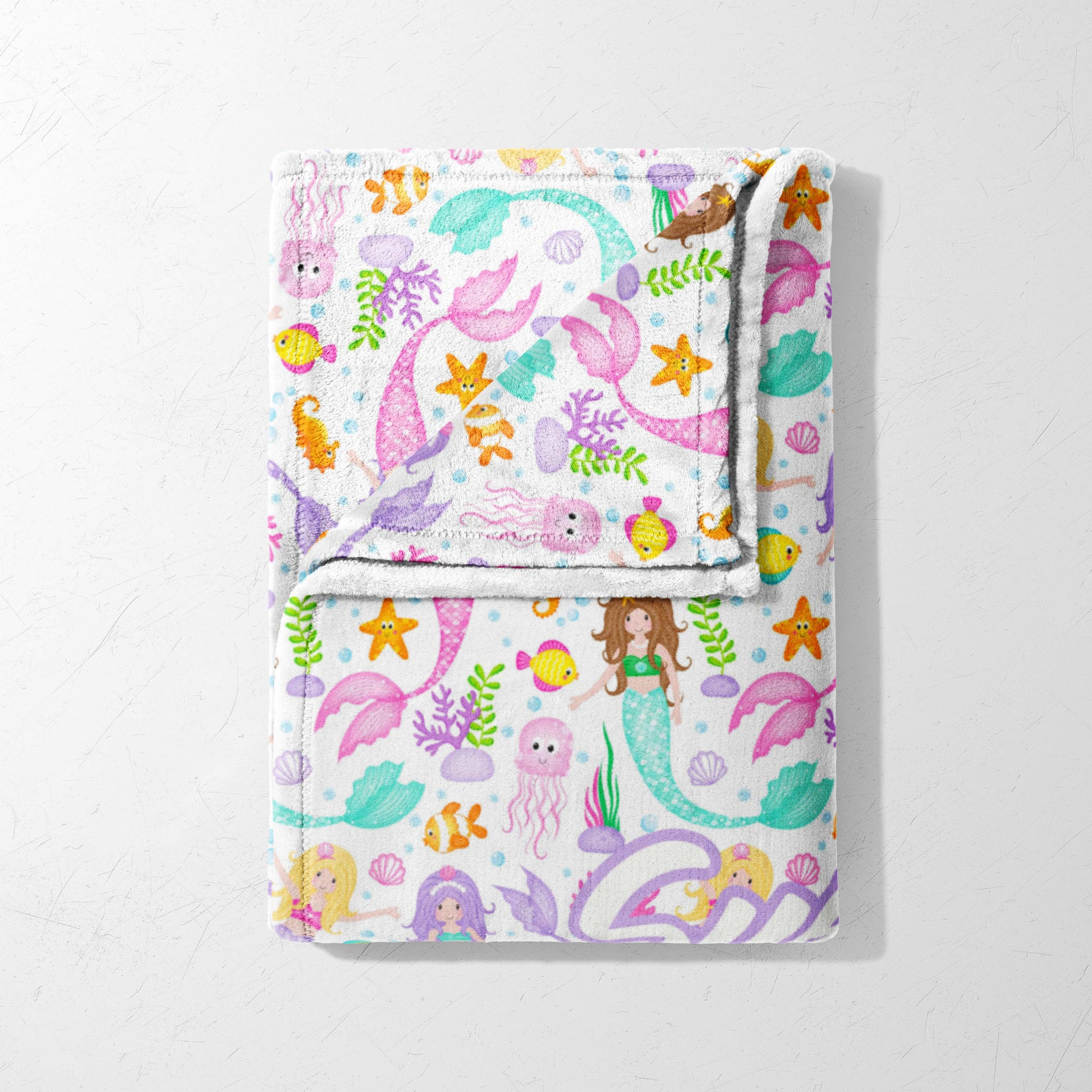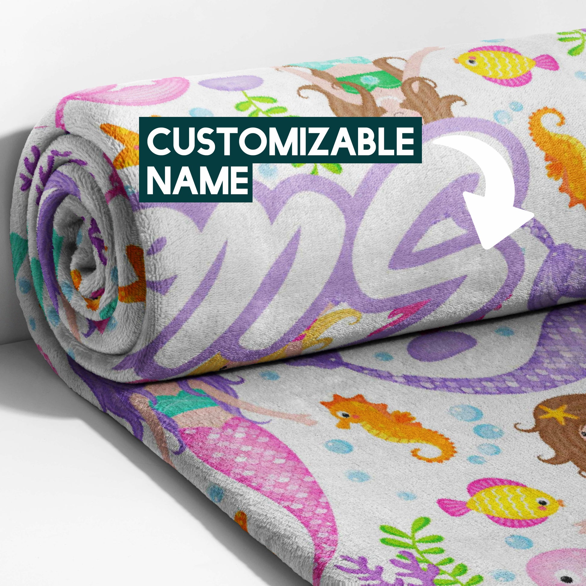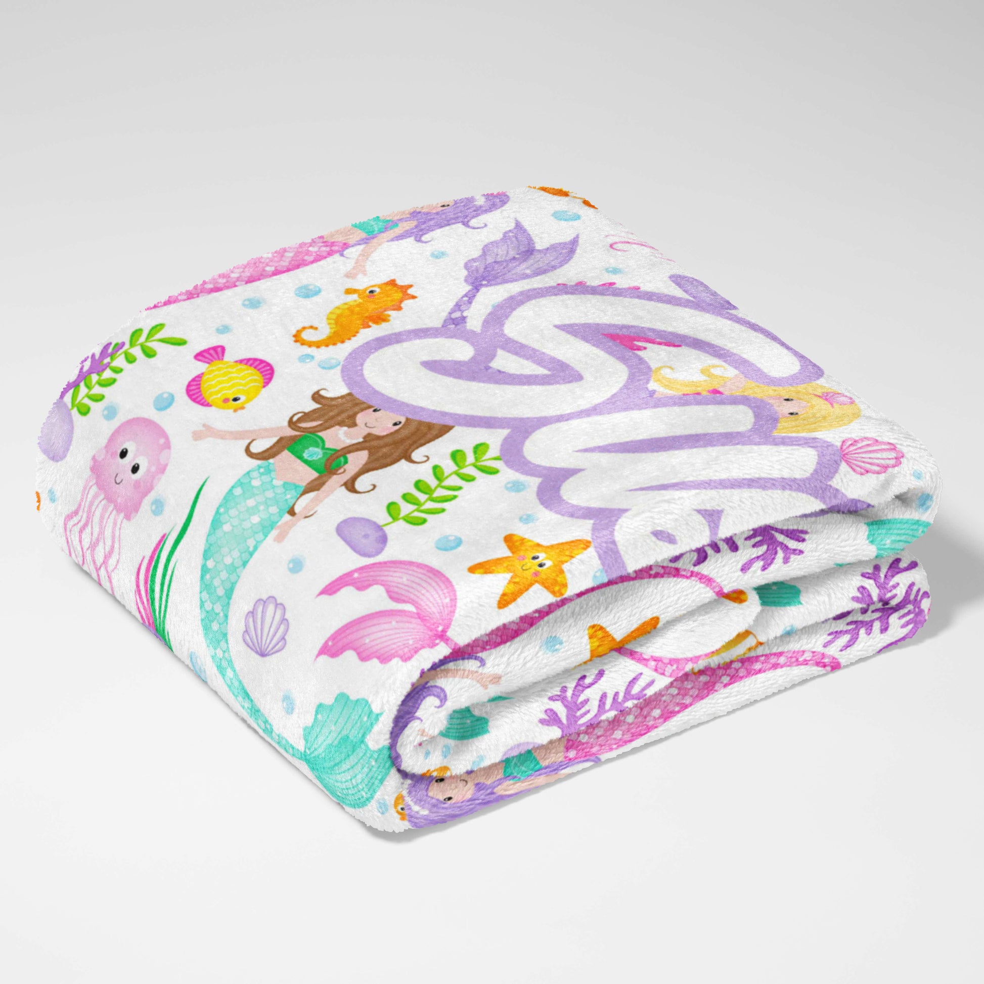 Dive into a world of wonder with the Undersea Mermaid Personalized Snuggle Blanket! This blanket is perfect for your little dreamer, featuring a playful pattern of colorful mermaids, friendly fish, and swaying seaweed. Made from the coziest, high-quality fleece, it's perfect for snuggling up during nap time, story time, or any time your little one needs a warm embrace. This throw isn't just incredibly soft; it's also personalizable, making it a truly unique and cherished gift. Imagine adding your little one's name to make it extra special! Whether it's for playtime or bedtime, this blanket is sure to make a splash.